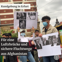 Die Kundgebung am Mittwoch wurden organisiert vom Migranten Omid Verein - MOVE e.V., der Seebrücke Erfurt, dem Flüchtlingsrat Thüringen e.V. und Frauen für den Nahen Osten e.V.