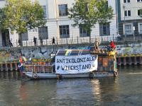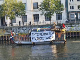Autoren: Alvaro Garreaud und Tobias Mönch. Foto: Am 08. Oktober gingen Zapatistas symbolisch als „Dekoloniale Invasion“ von einem Boot auf der Spree an Land. Foto: Tobias Mönch.