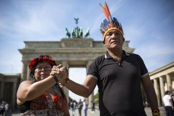 Alessandra Korap Munduruku und Olimpio Guajajara, zwei der bekanntesten indigenen Aktivist*innen aus dem brasilianischen Amazonasgebiet, waren zu Gast in Berlin. Unterstützt von Survival International und der Arbeitsgemeinschaft Solidarische Welt machten sie auf einer kleinen Kundgebung vor dem Brandenburger Tor auf ihre lebensbedrohliche Lage aufmerksam. Gegenüber Radio onda schilderten sie ihren Kampf und ihre Forderungen.