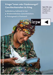 "Krieger*innen oder Friedensengel? - Geschlechterrollen im Krieg" ist der Titel für das Herbstheft der iz3w und befasst sich mit Rollenbildern von Frauen und Queers in kriegerischen Konflikten. Schon hier fällt auf wie sehr die Unterteilung in zwei Geschlechter sich mit Kriegen verstärkt und patriarchale Muster wiederkehren. In manchen Fällen sind Regionen nach feministischen Kämpfen sogar patriarchaler als vor dem Kampf.